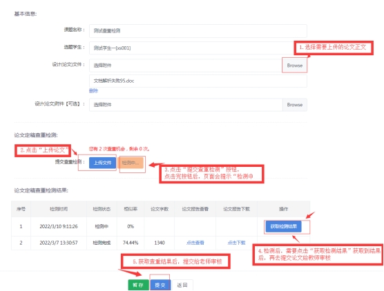 第二步:点击“上传文件”,上传正文定稿,再点击“提交查重检测”,等待几分钟后,观察页面底部状态栏,并获取查重报告。然后将查重报告上传到附件。