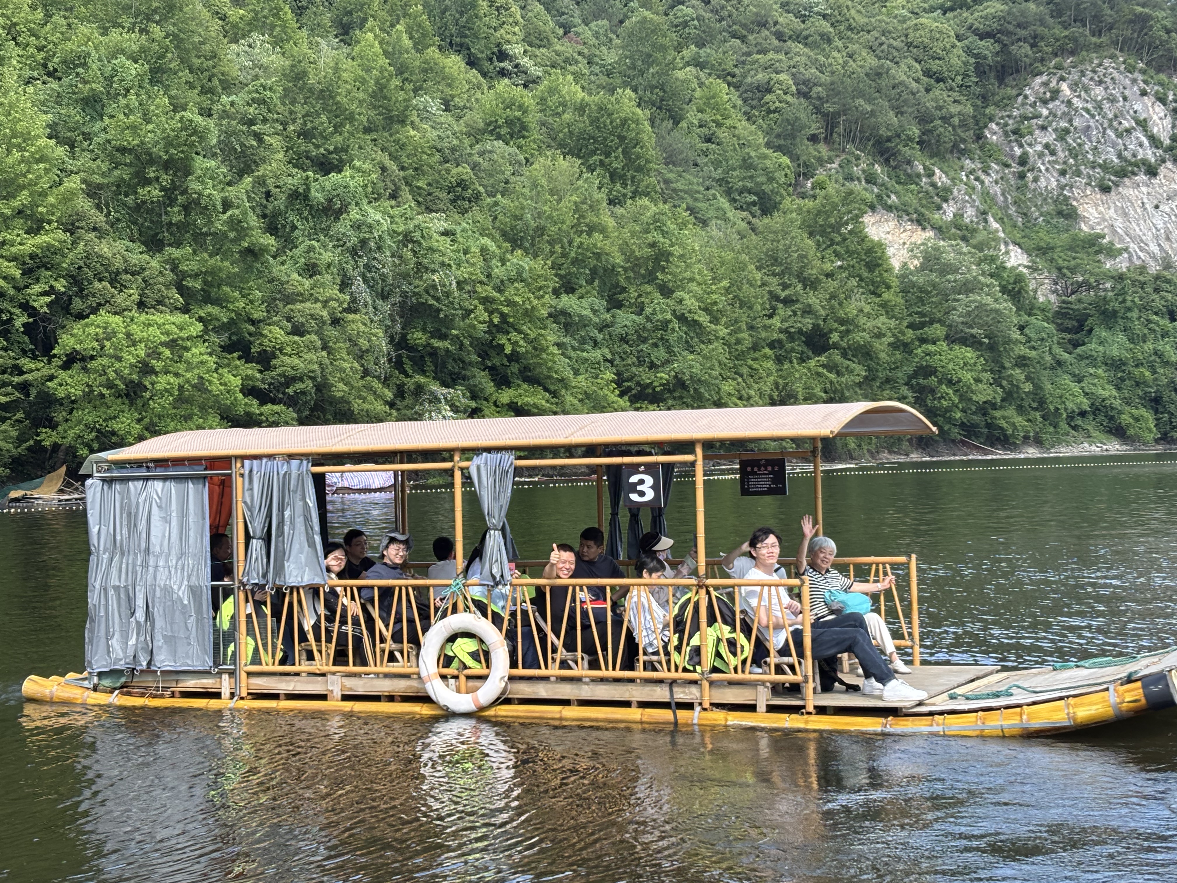 出了溶洞,穿过天成野槠林,来到岩岭湖,湖四周青山环抱,湖面碧波荡漾。乘坐竹筏在湖面上穿行,清新的空气扑面而来,满满的负氧离子让人心旷神怡。