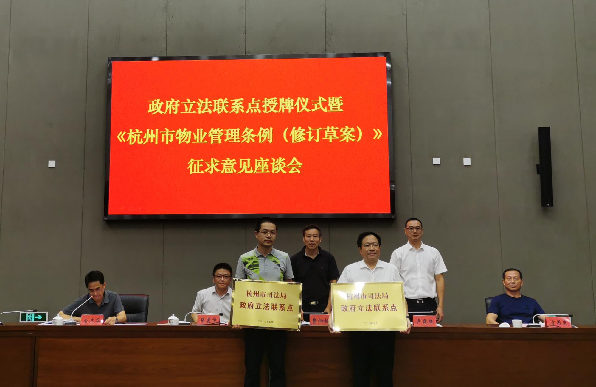 8月25日,杭州市司法局政府立法联系点授牌仪式暨《杭州市物业管理条例(修订草案)》征求意见座谈会在杭州市市民中心会议厅召开。杭州市司法局、市场监管局、住房保障和房产管理局、工商联等单位的领导出席会议。会上宣读了《关于确定政府立法联系点的通知》(杭司[2019]176号),为深入贯彻习近平新时代中国特色社会主义思想和党的十九大精神,落实党中央关于“建立基层立法联系点制度,推进立法精细化”的要求,根据《杭州市司法局政府立法联系点工作规定》,经组织申报、推荐和研究,确定14家单位为政府立法联系点。其中,鉴黄师