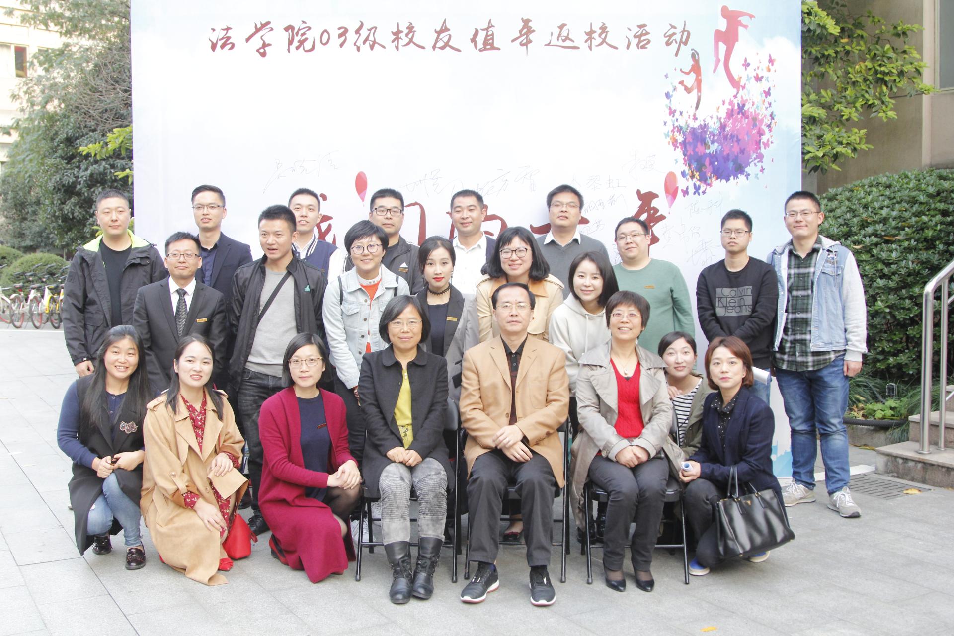 303教室,03级校友们十年后重返课堂,03级曾经的任课老师茅铭晨老师、沈建萍老师、李春燕老师应邀参加活动,带领同学们上了特殊的一课。这节课整整持续了三个多小时,茅铭晨老师回忆了与03级同学在校的点滴,分享了与03级同学的情谊,同时他告诉同学们不断自我提升与从容心态的重要性,也鼓励同学们加强与学院的交流。沈建萍老师则分享了自己的从业经历,并提醒校友们在职业发展的道路上不应急于求成,同时结合自身生活体验告诉同学们处理好家庭与事业之间的关系至关重要。李春燕老师的分享真挚而细腻,结合自己的工作生活经历以及遭遇挫折时的心路历程,告诉同学们良好、健康的心态对生活和工作都有着重要的促进作用。