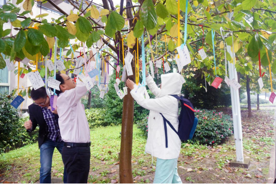 楼下拍照合影。岁月改变了年轻的脸庞,却没有改变他们那颗热爱母校的心。在学院楼下,校友们纷纷将自己对学校的缕缕情丝写进卡片并系在门口生气盎然的大树上。风雨中飘舞的缕缕绦丝,诉说着脉脉动人法情。